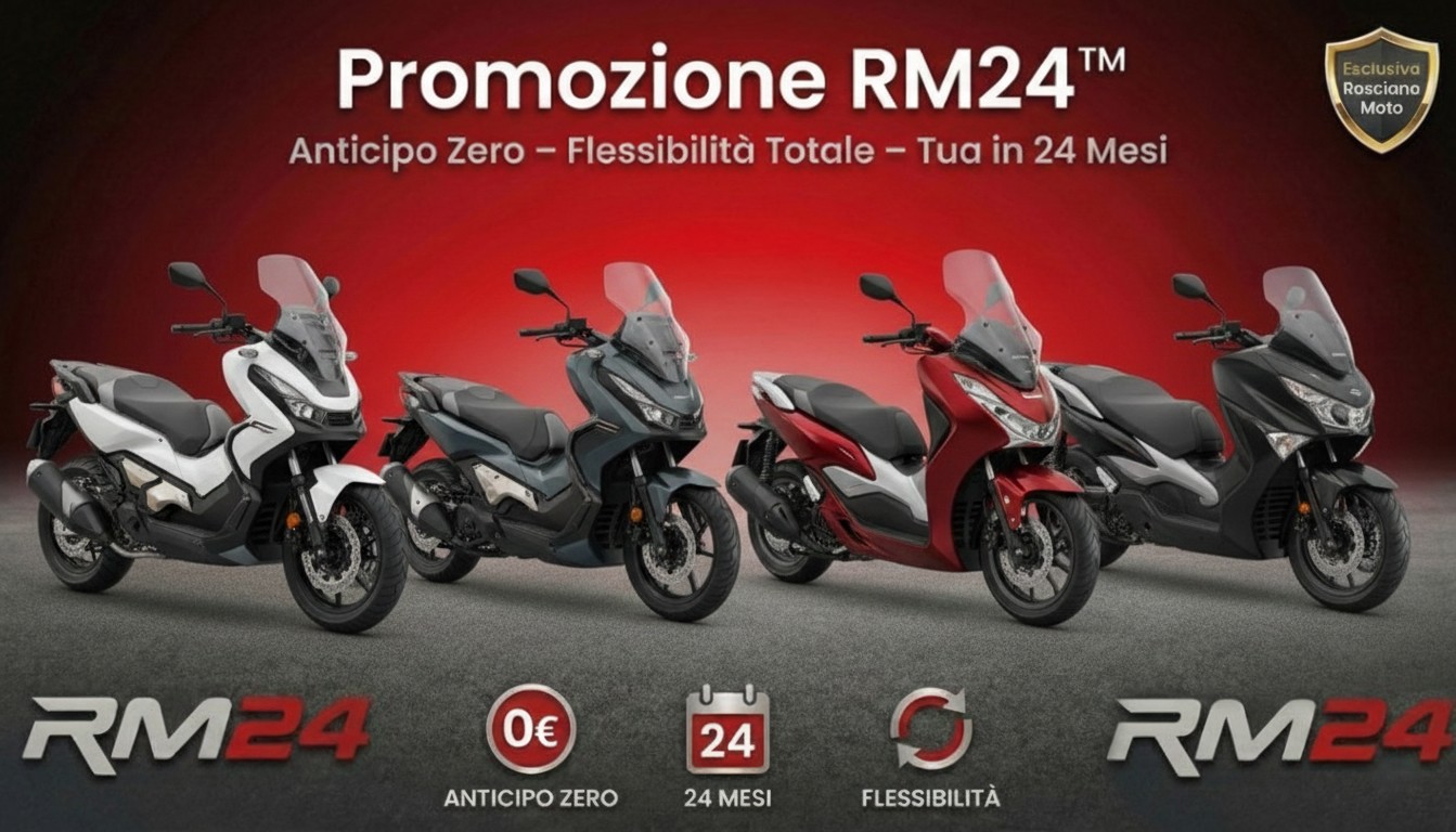 Le Promozioni Scooter RM24™ rappresentano l'evoluzione della promozione scooter rm24 classica: una formula sviluppata internamente da Rosciano Moto, pensata per offrire zero anticipo, rate personalizzate e libertà di scelta dopo 24 mesi, mantenendo sempre il pieno controllo del veicolo e dei costi.