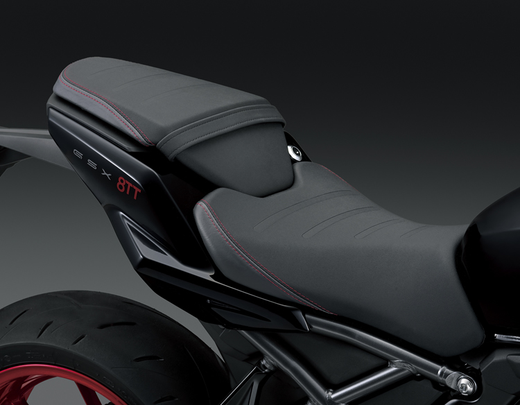 La GSX-8TT ha cupolino anteriore, puntale (Under Cowl) e sella con cuciture rosse; la 8T è naked con faro rotondo e sella "Tuck-and-Roll".