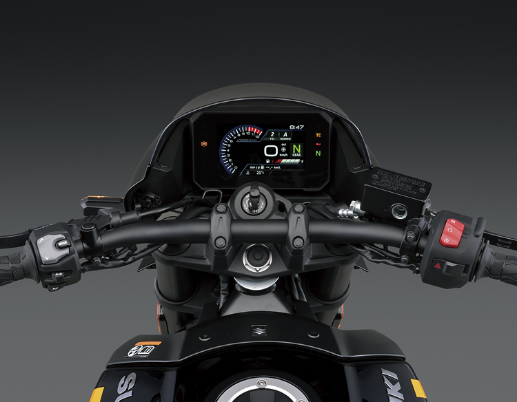 Motore parallelo DOHC da 776 cc, 83 CV (61 kW) a 8.500 giri/min, coppia massima 78 Nm a 6.800 giri/min. Manovellismo a 270° per coppia generosa e sound piacevole. Sistema Suzuki Cross Balancer per ridurre vibrazioni e garantire fluidità di guida.